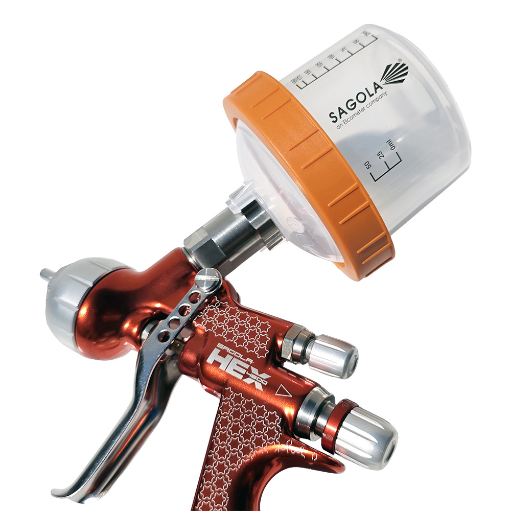 The Sagola DPC System is available in small (6.8 oz.) and large (20 oz.) cup sizes; and any spray gun can be converted to use the DPC System with a simple adapter.